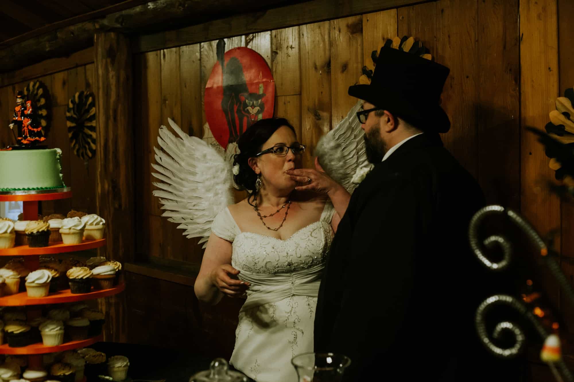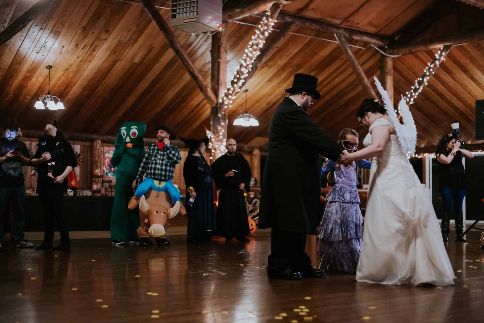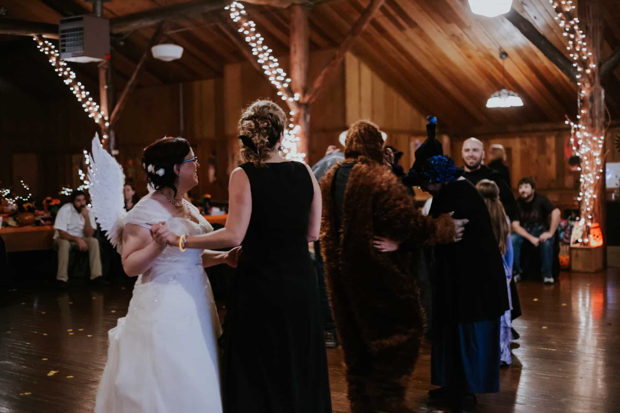 Then… the guests arrived. The mad hatter, Gumby, Zombie Elsa & Zombie Anna. A unicorn, a princess…. Jack Skellington. Everyone played along and wore their costumes. Including yours truly and the photography team, who were dressed like cats of course. The moment came after the ceremony and portraits when I thought this wedding couldn’t get ANY better. That is the moment Christina chose to reveal her costume by adding beautiful white Angel wings to her gorgeous white wedding gown.