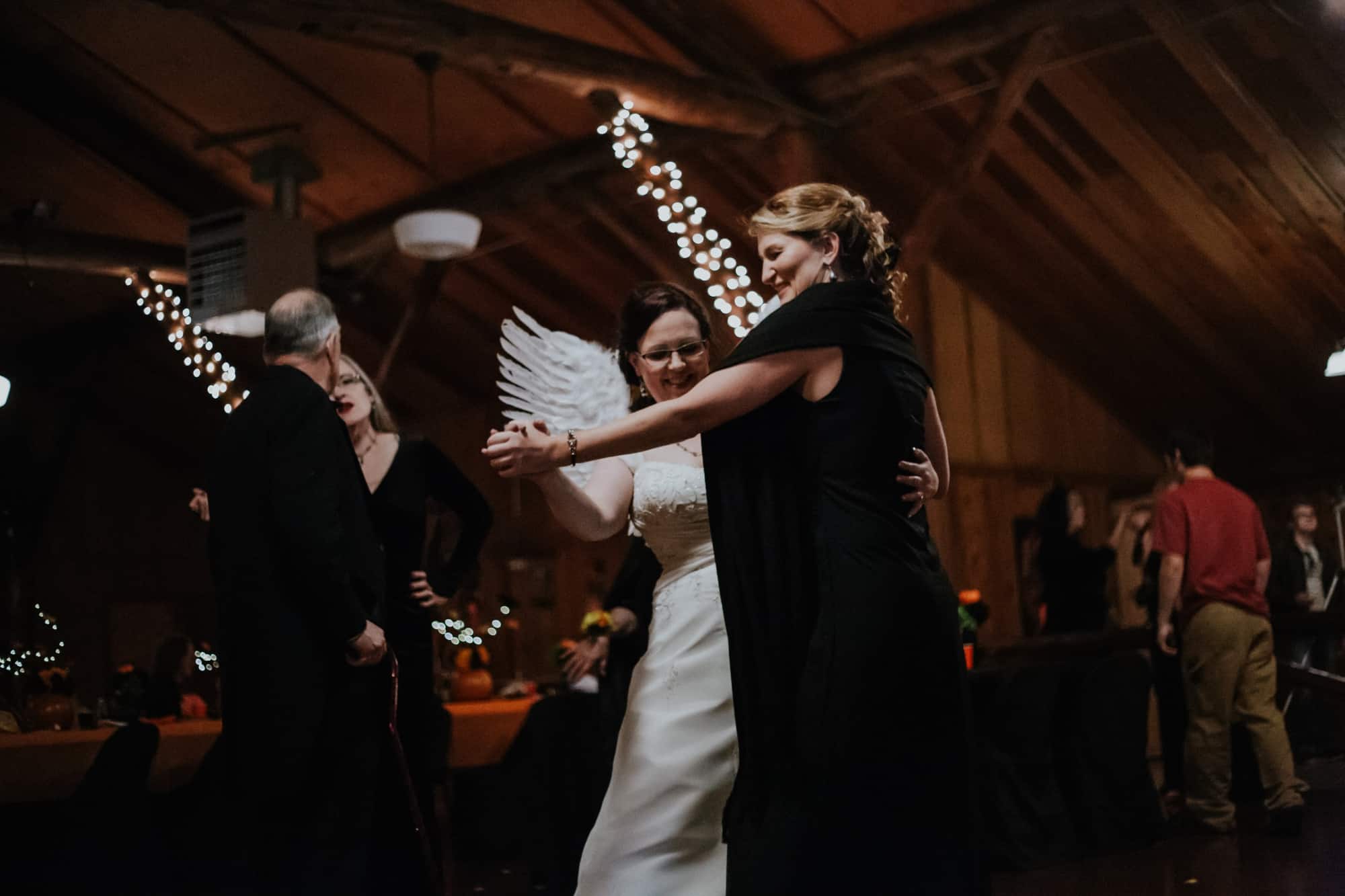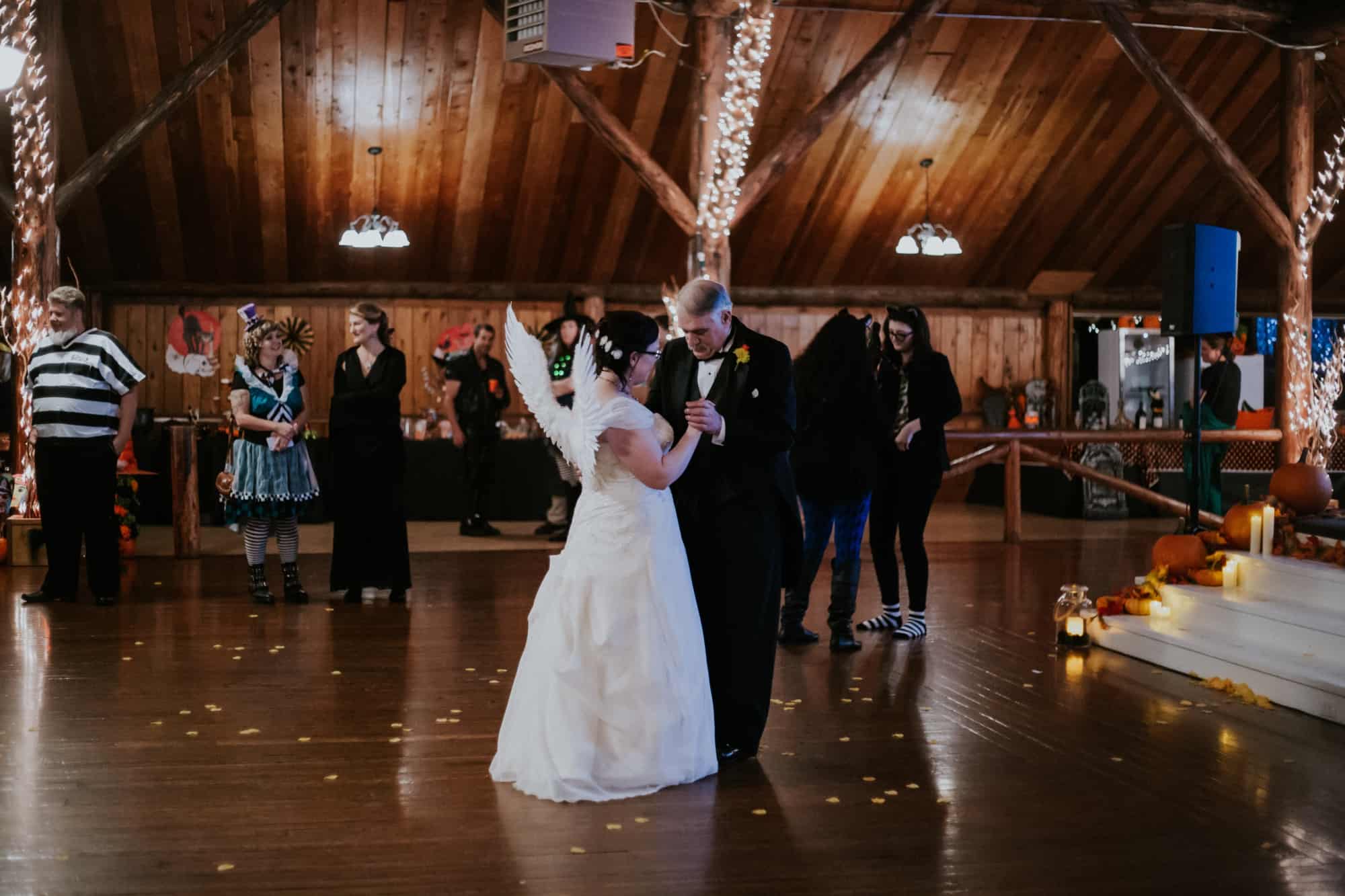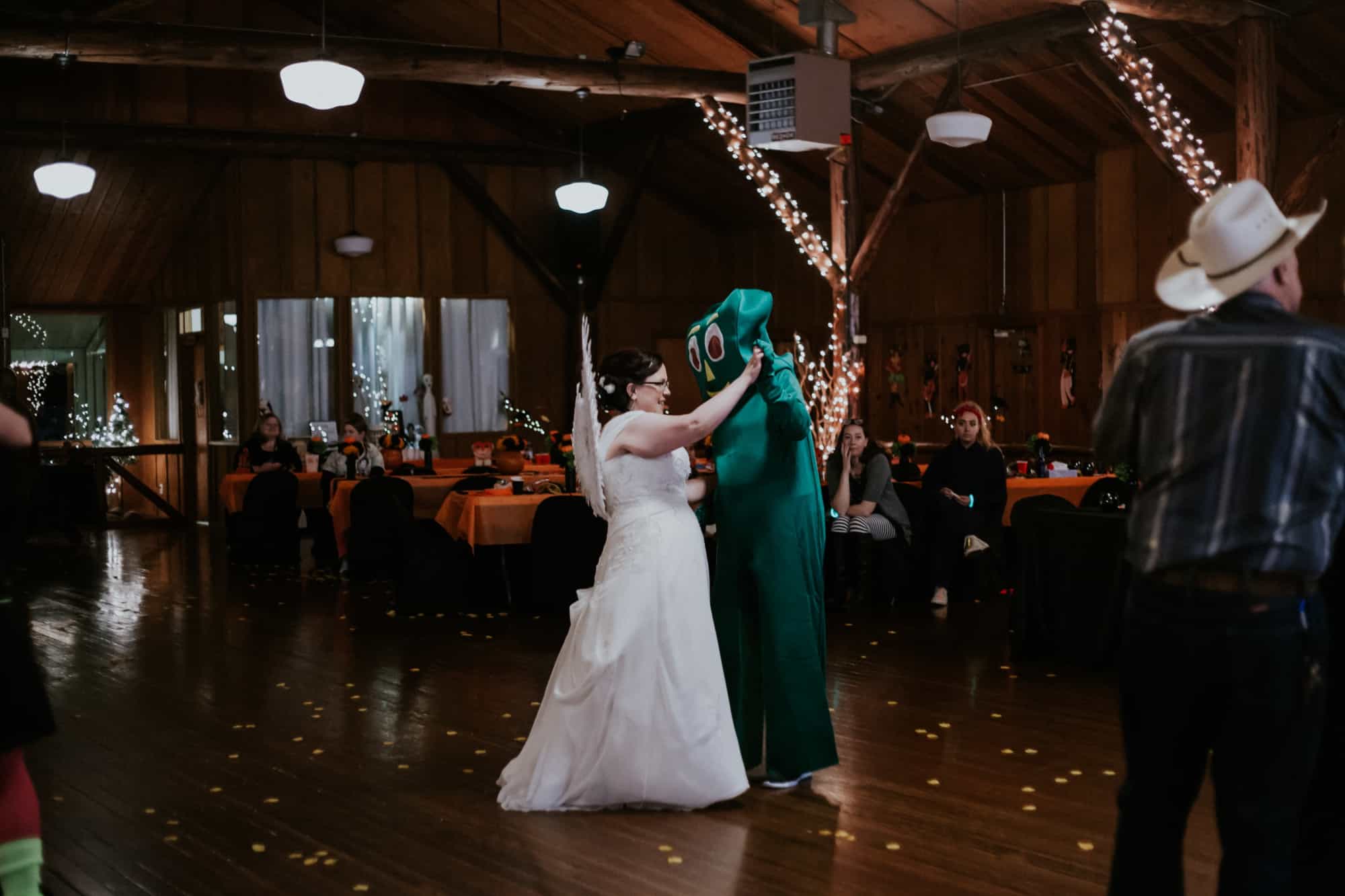 Then… the guests arrived. The mad hatter, Gumby, Zombie Elsa & Zombie Anna. A unicorn, a princess…. Jack Skellington. Everyone played along and wore their costumes. Including yours truly and the photography team, who were dressed like cats of course. The moment came after the ceremony and portraits when I thought this wedding couldn’t get ANY better. That is the moment Christina chose to reveal her costume by adding beautiful white Angel wings to her gorgeous white wedding gown.
