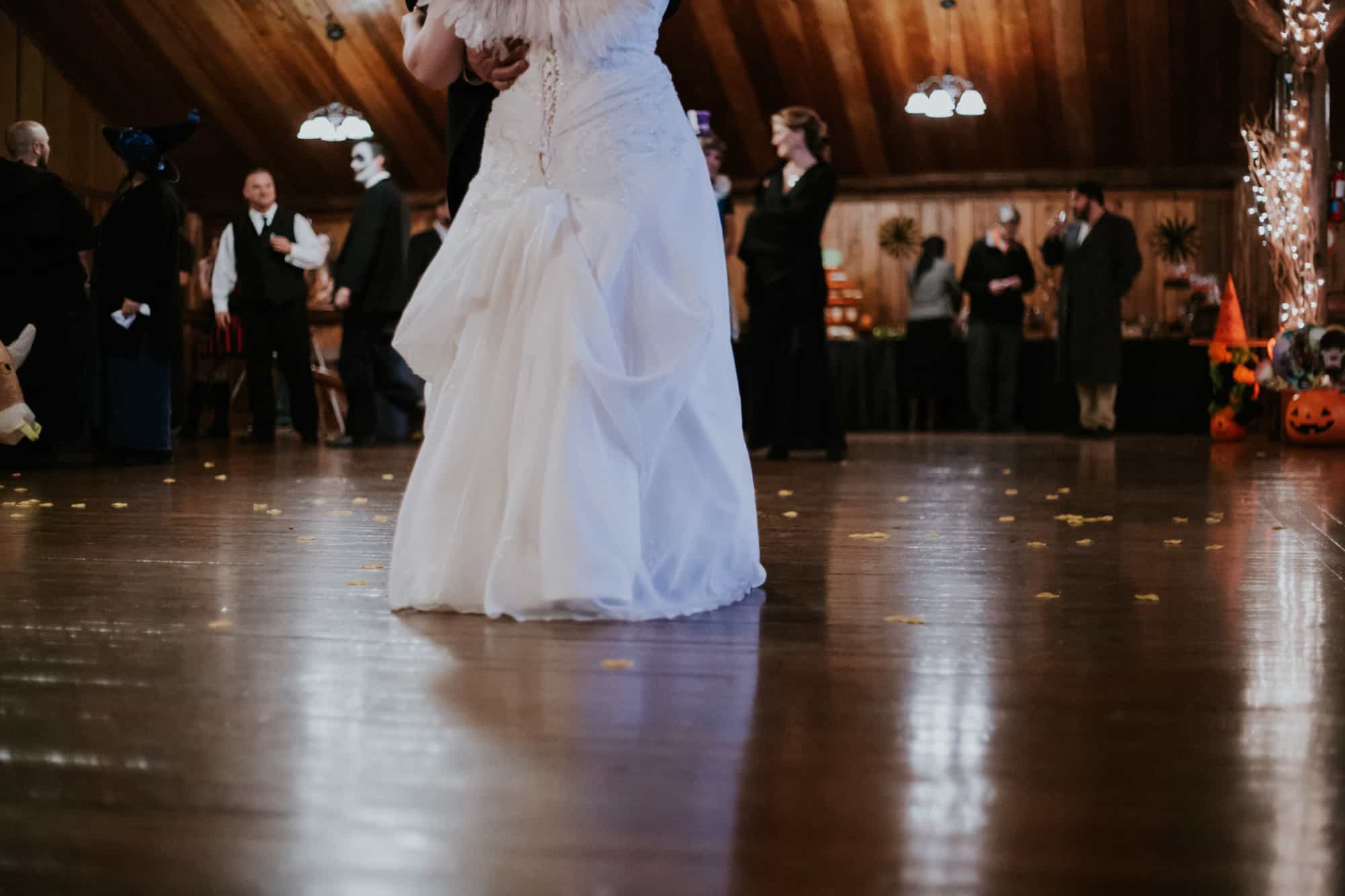 Arriving at Lake Lawrence Lodge, I had no idea what I was in for. The quaint little lodge sits back where most people wouldn’t venture. Surrounded by homes, it appears to be a members only community center, but they rent out for weddings and events. Inside I found the place decorated in pumpkins, masquerade masks, spiders and even a skeleton bride and groom complete with caskets. From I do to death beds all in one night huh?