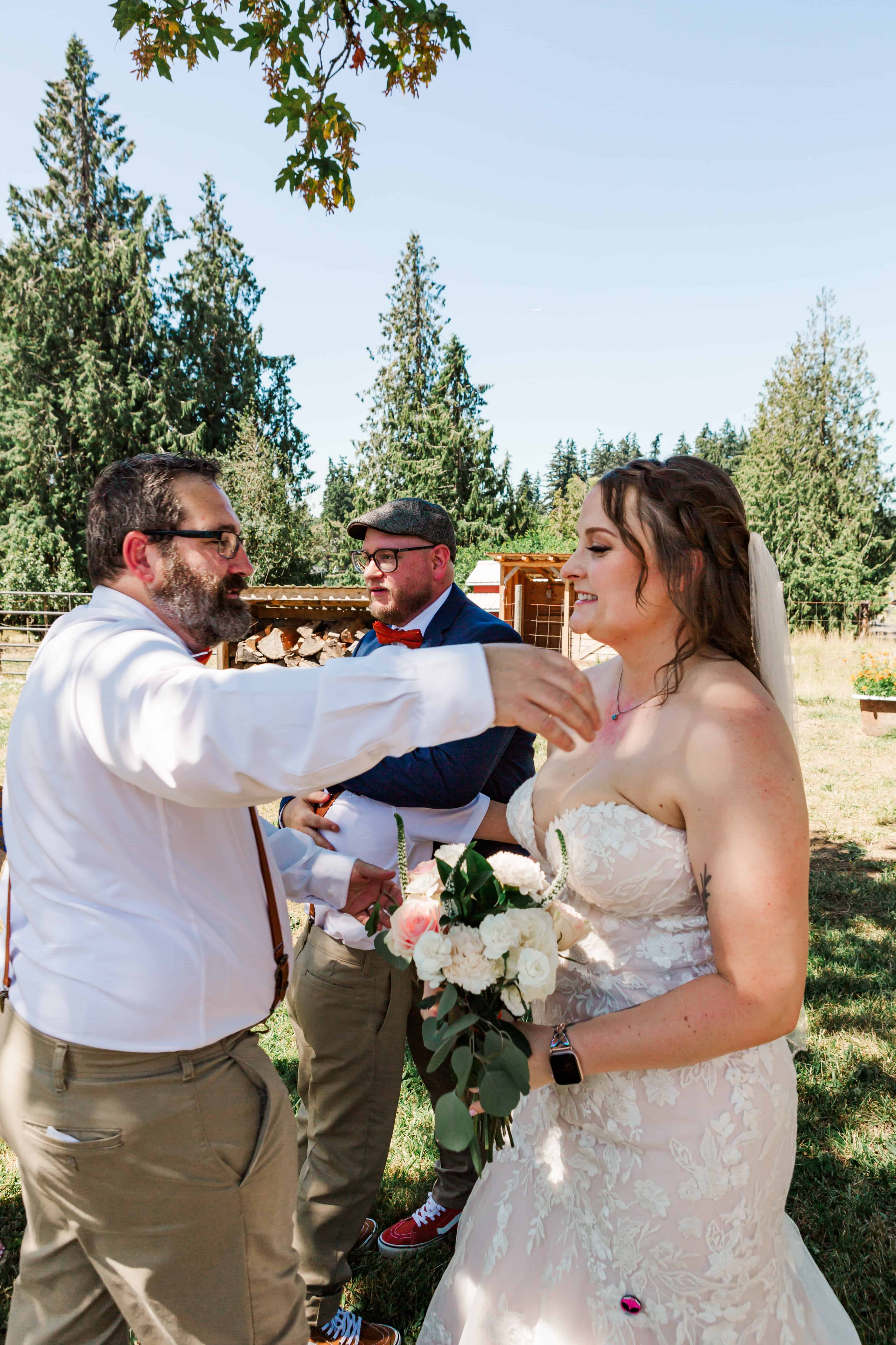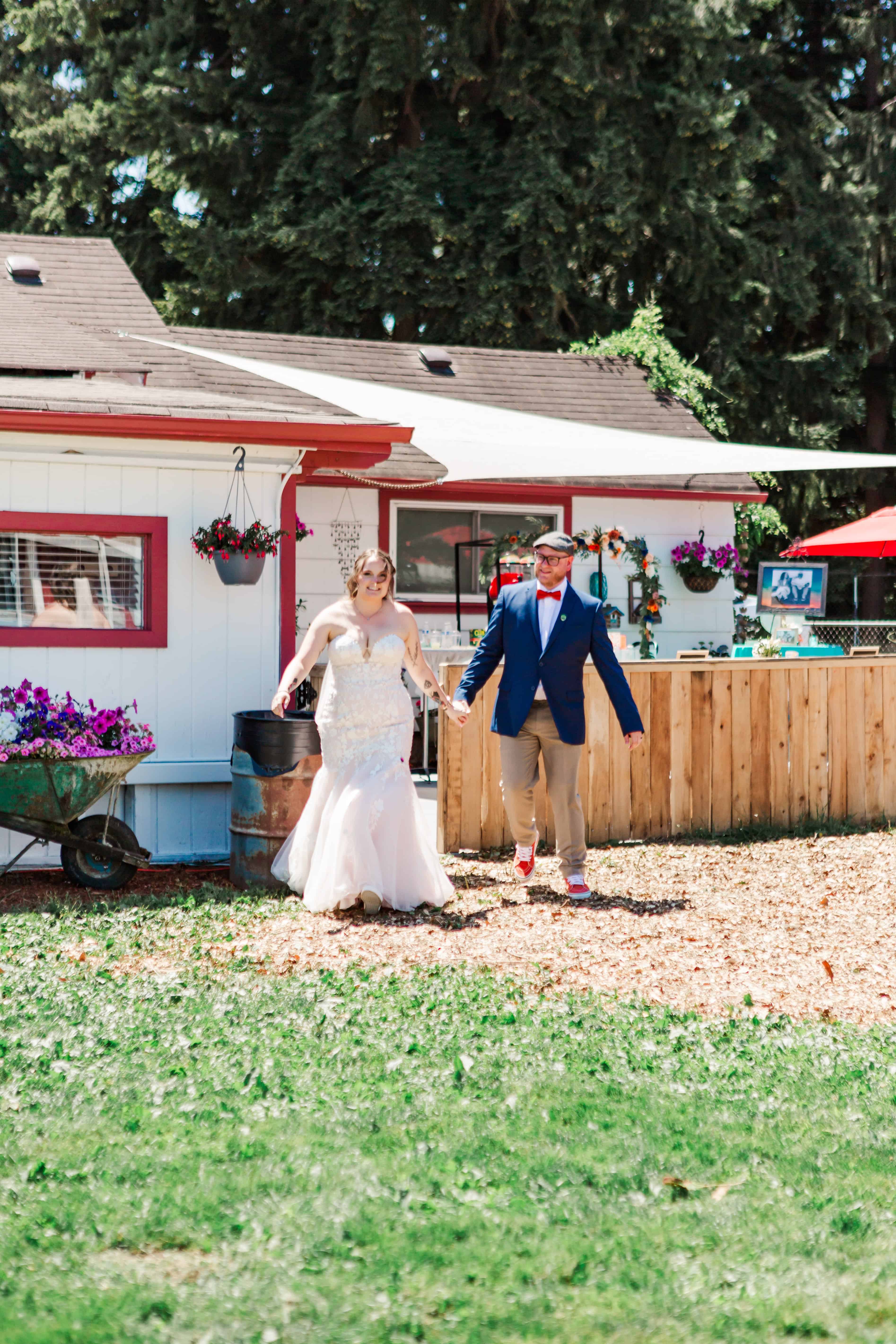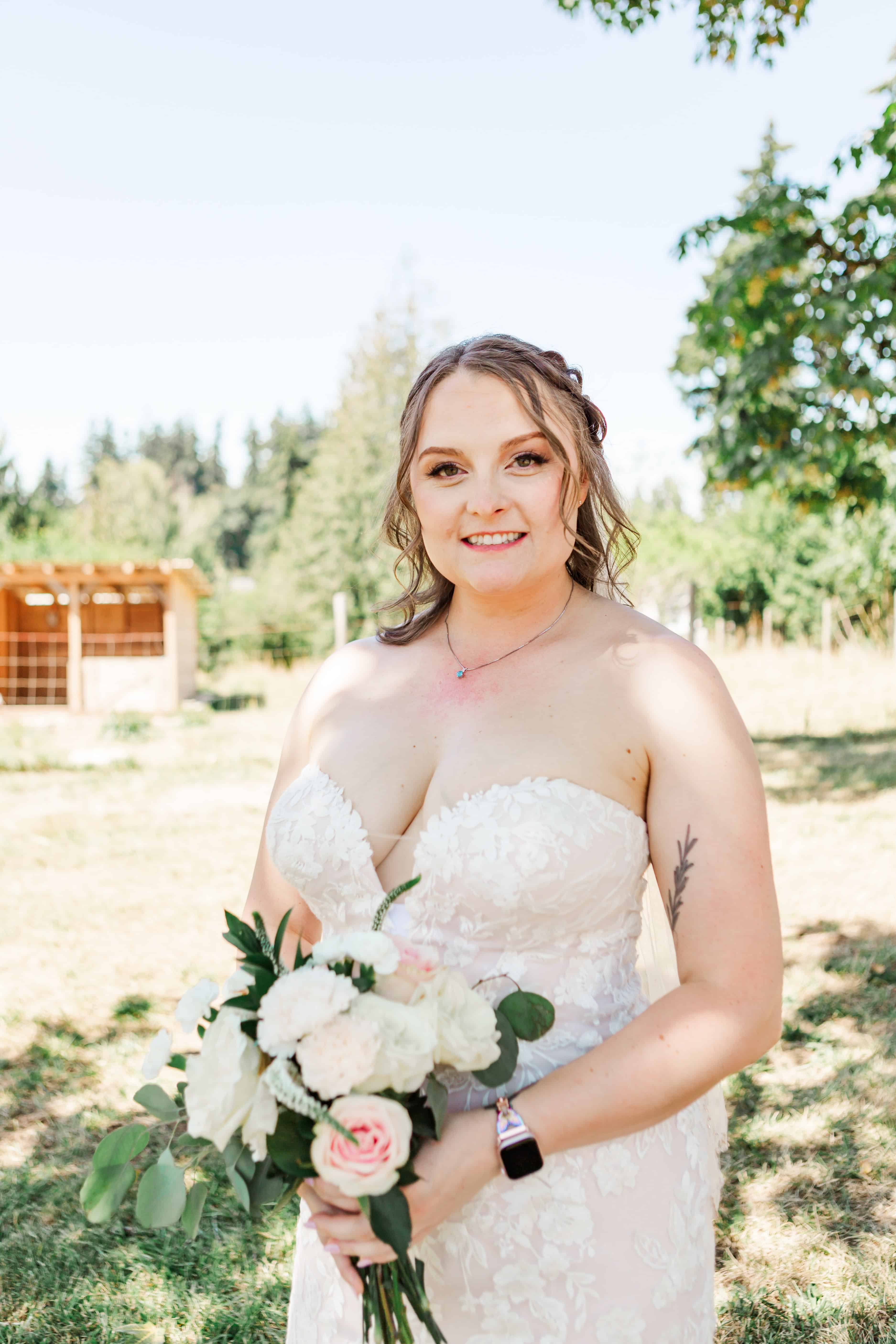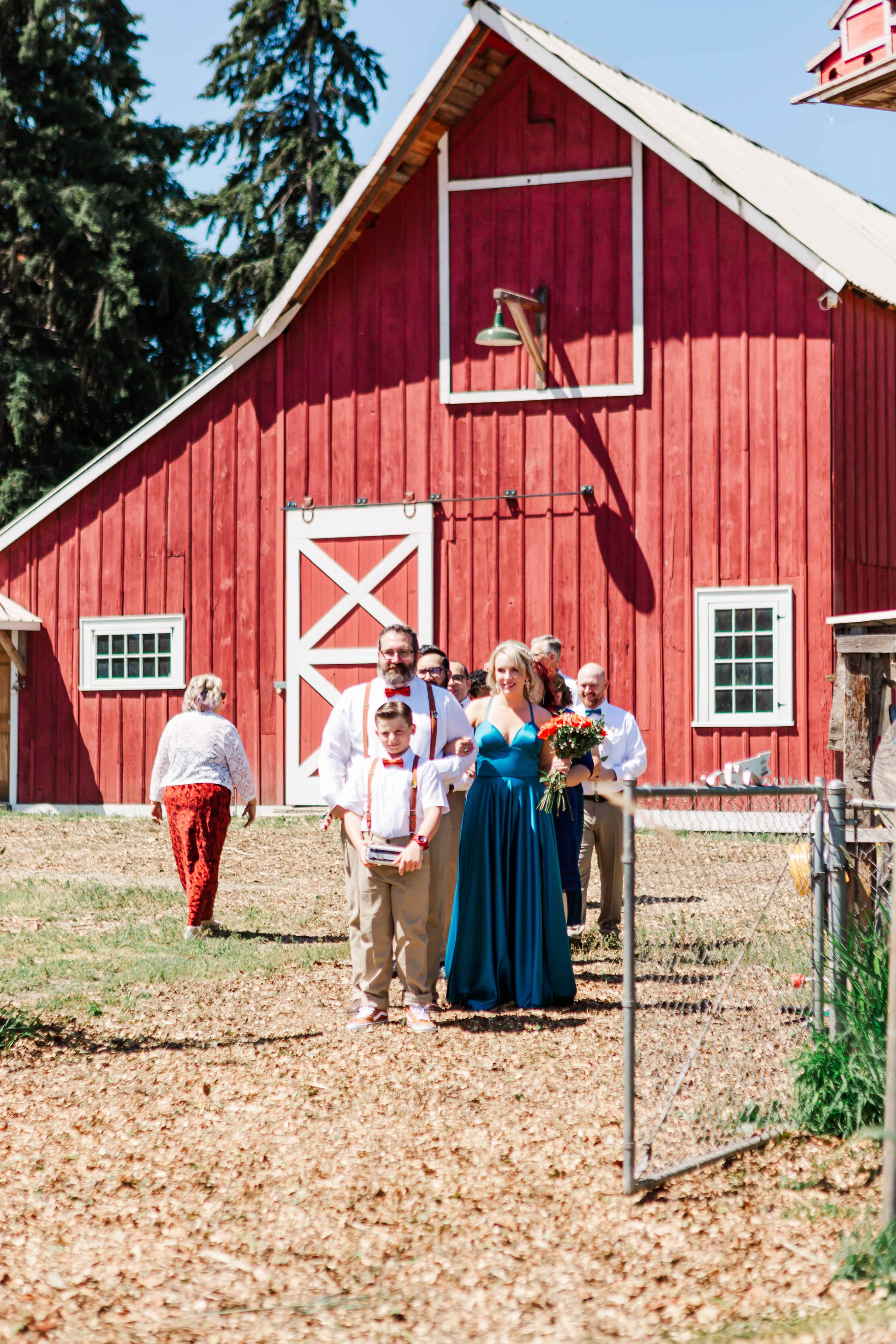 Let’s talk about this venue. Nestled in Edgewood, Washington, Fluffy Butt Farm is the kind of place that oozes family, love, and a little bit of chaos in the best possible way. Lauren’s parents moved onto the property a few years back, and it’s since become a gathering place for weddings, celebrations, and yes—backyard chickens with personalities big enough to inspire the farm’s unforgettable name.