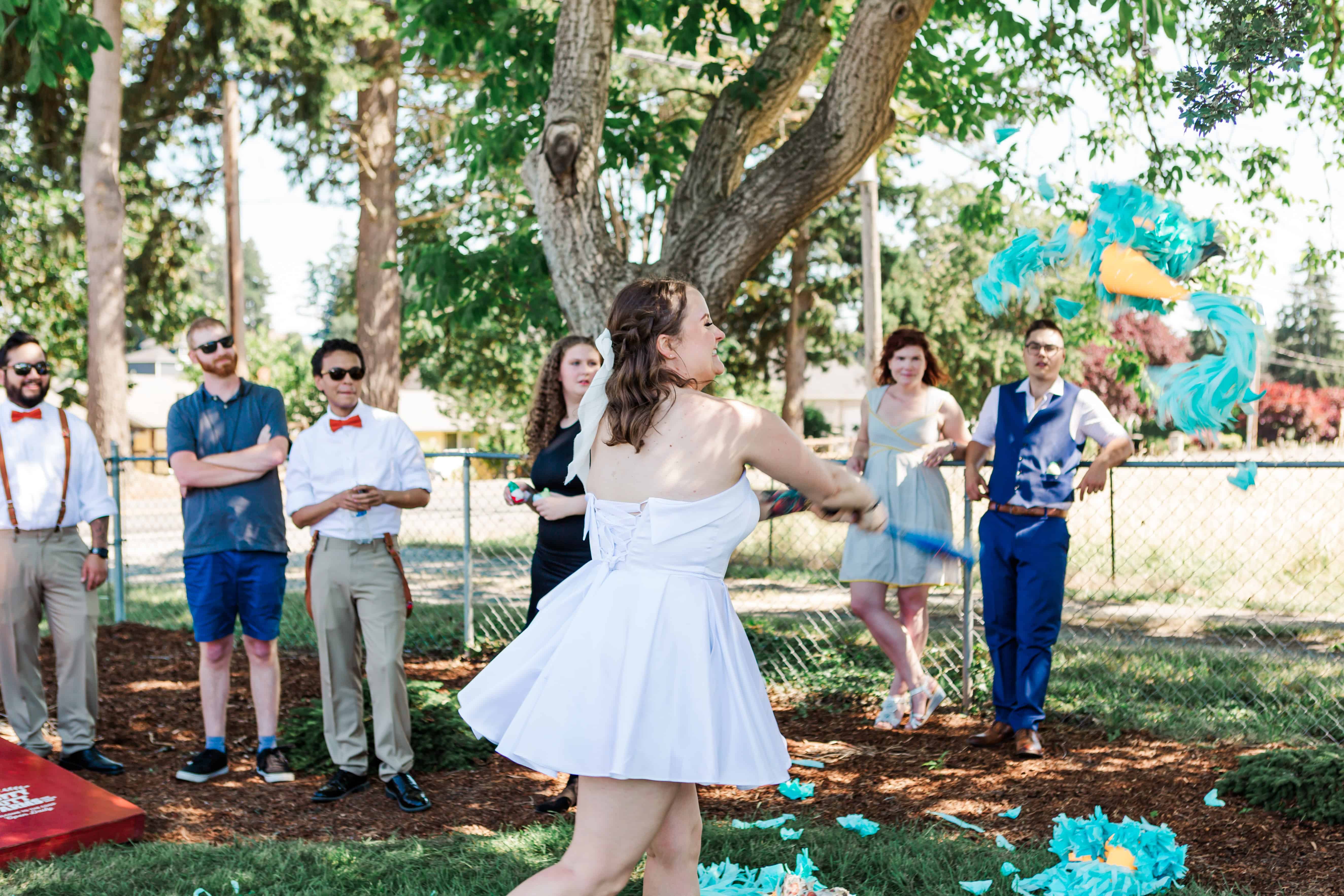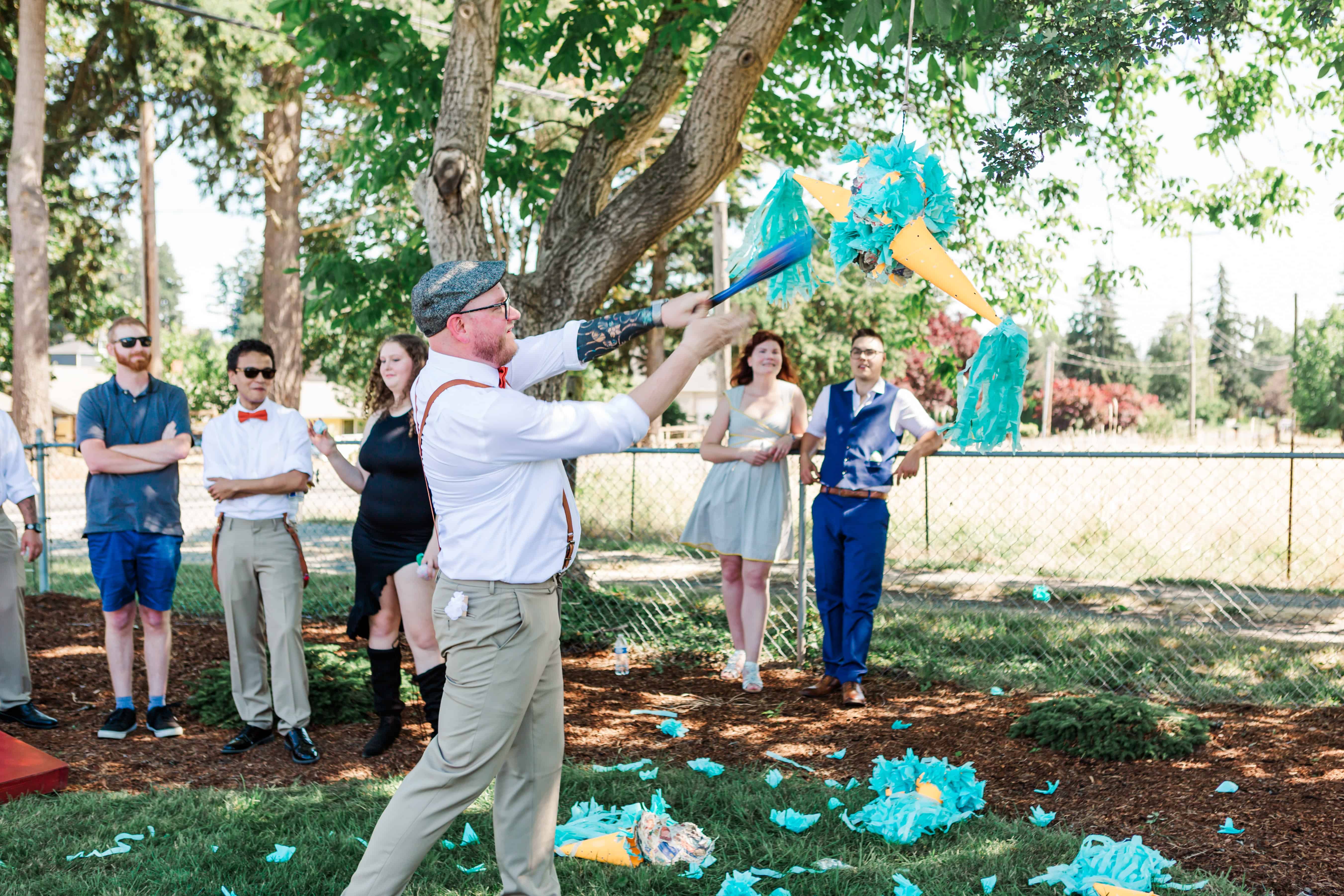 After the vows and a round of slushy bar refills, guests ducked into the shade of the tent to snack, sip, and celebrate. As the afternoon rolled on, Lauren’s dad made one final surprise entrance—with a piñata handmade by Paoula, one of the bridesmaids. The squeals, the candy flying everywhere, the pure joy—it was the perfect final touch to a day that was deeply personal and joyfully imperfect in the very best way.