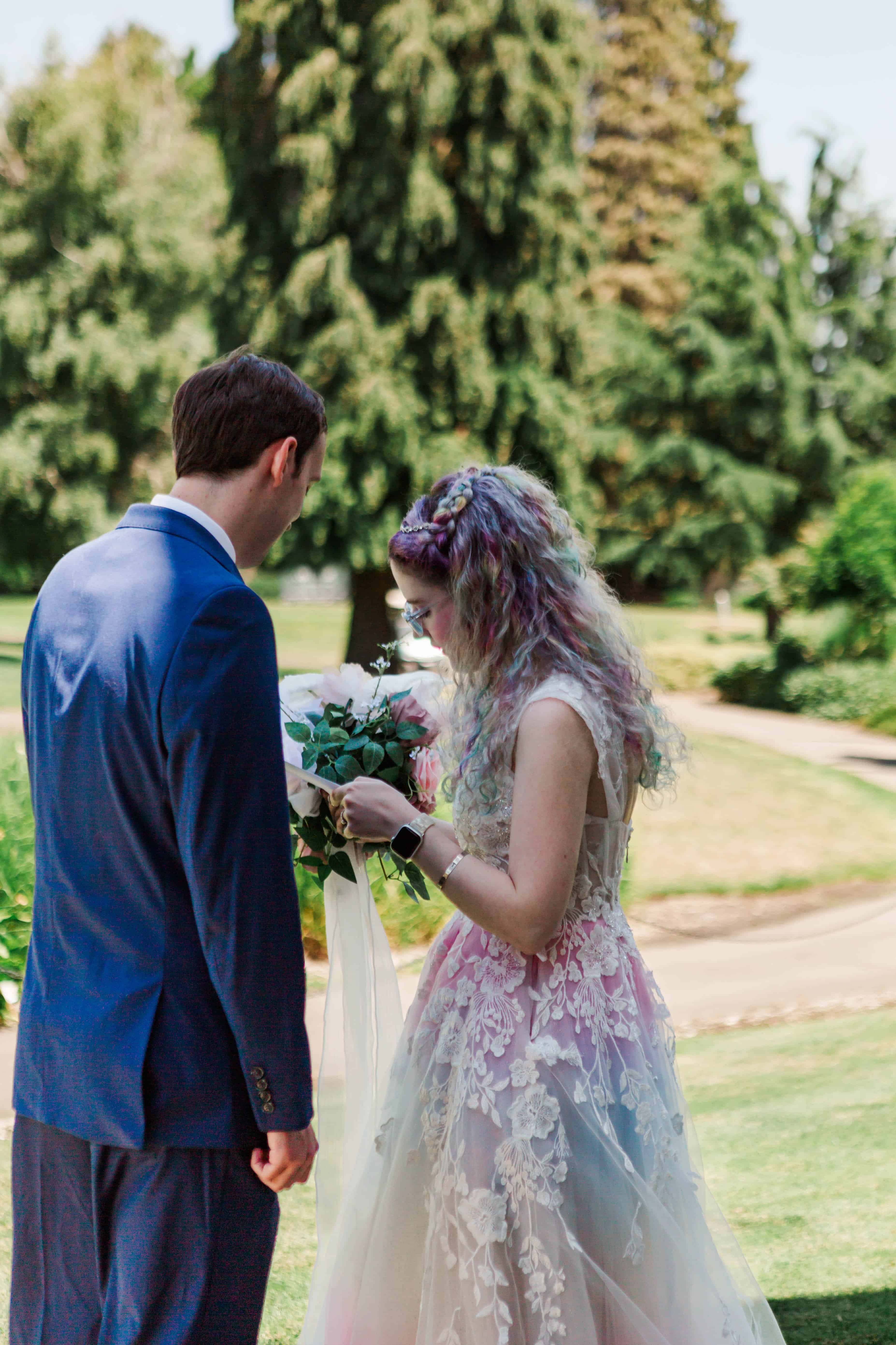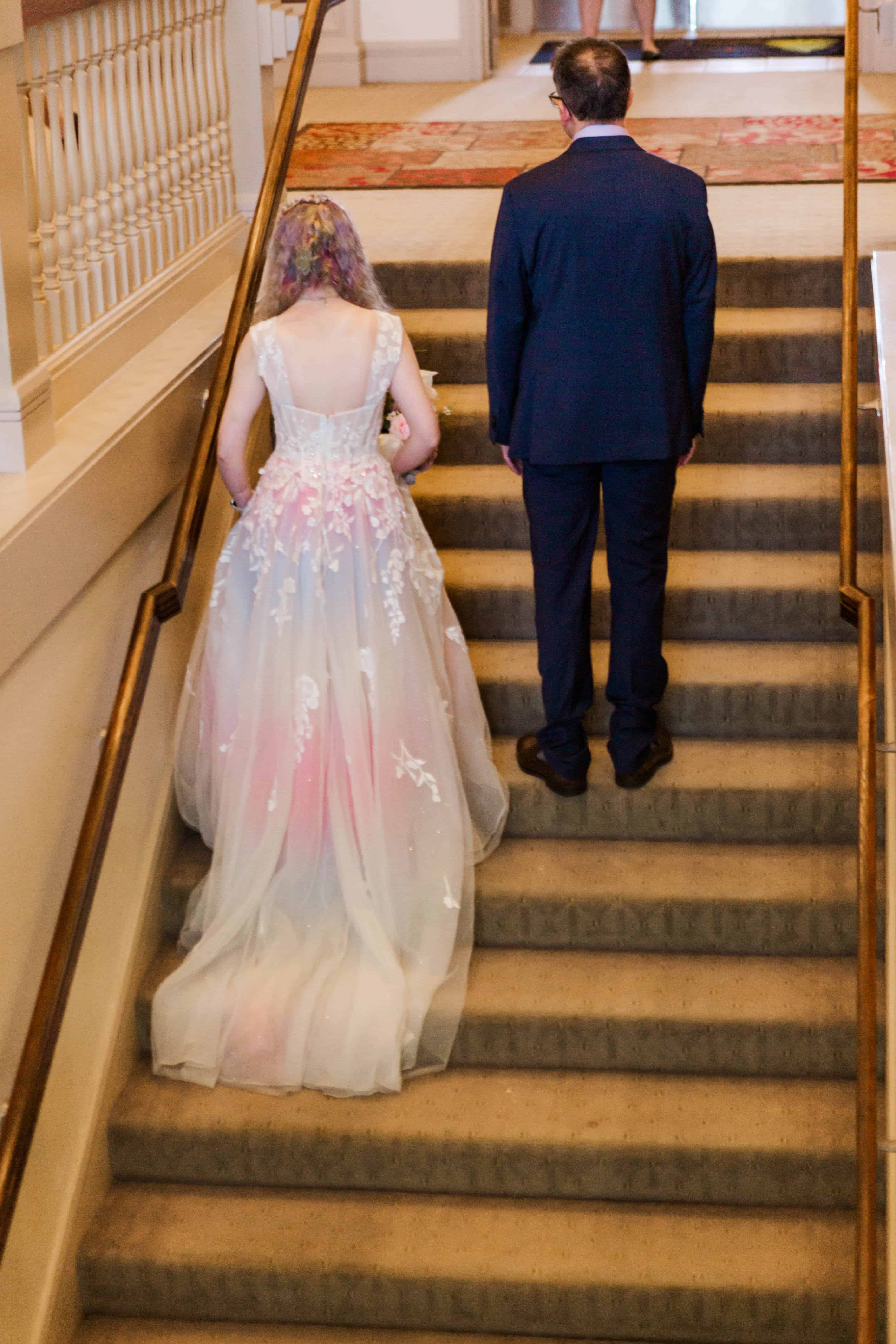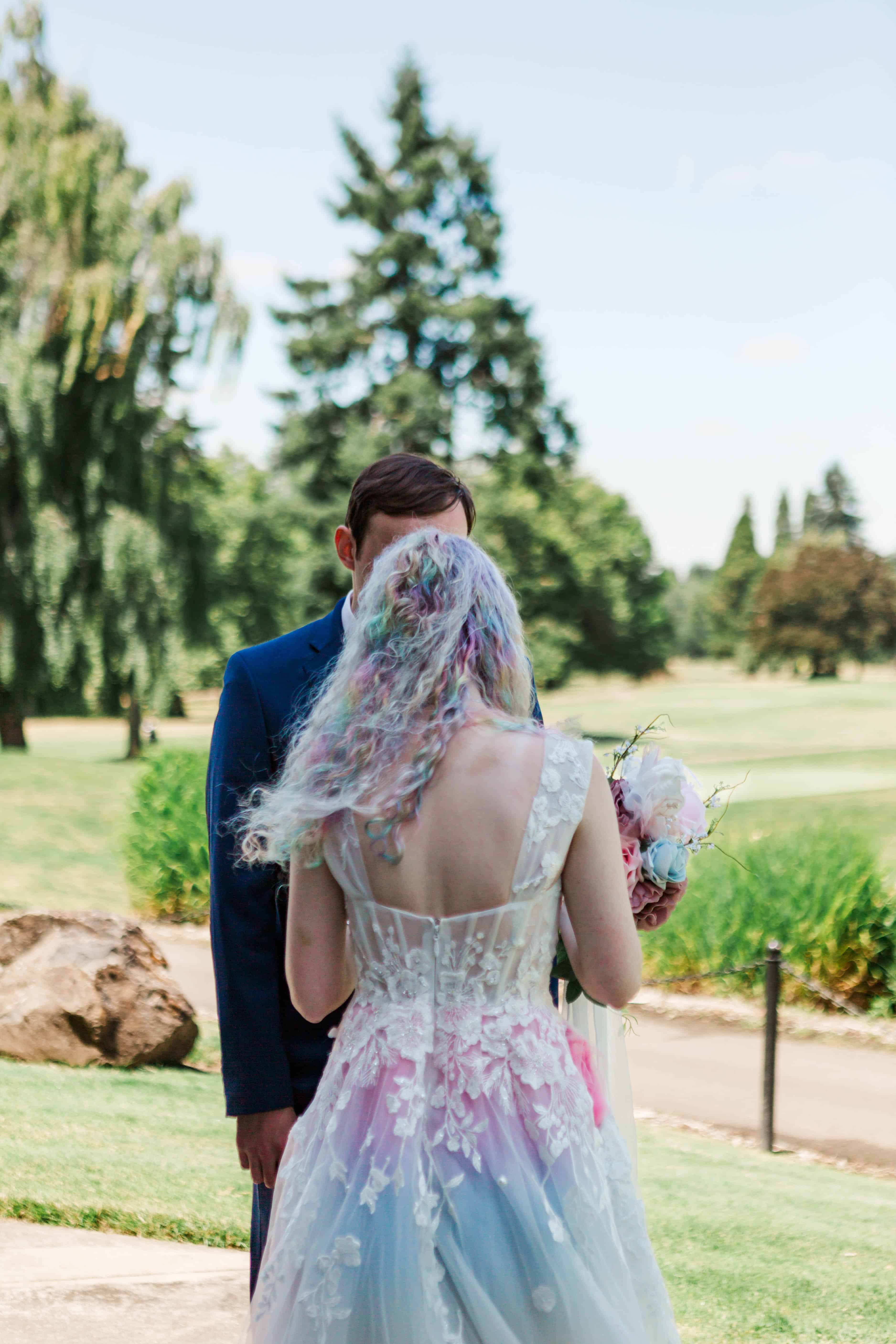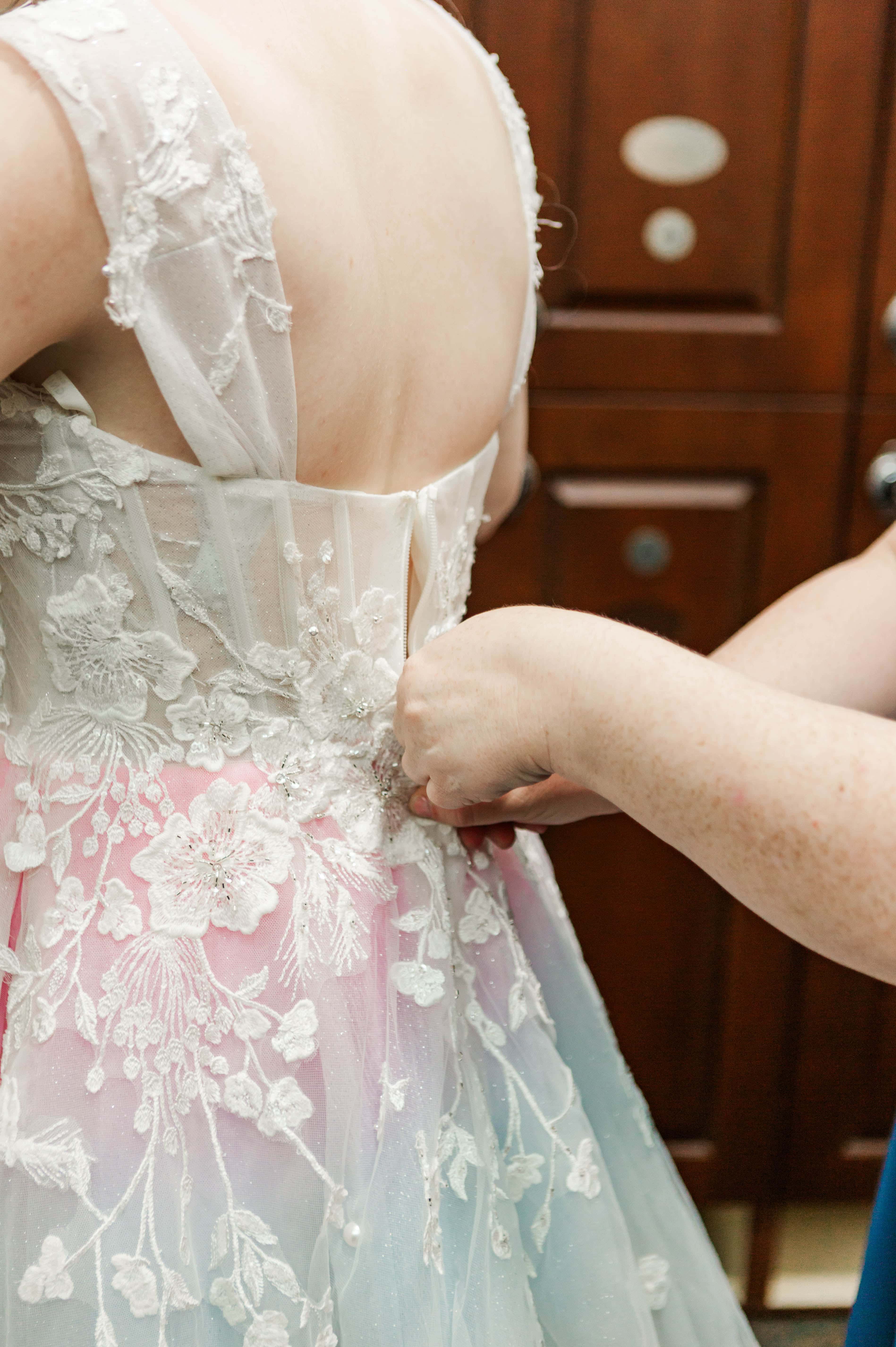 Looking back, it’s impossible to have predicted the steps we took to get to their final wedding day, but after their sudden postponement turned into a micro wedding, we counted down the days to M+J’s big day. One may think that photographing the same details for multiple weddings would be a bore, however this wedding was anything but boring! You see, it features one of my career favorite dresses: the subtle rainbow wedding gown.